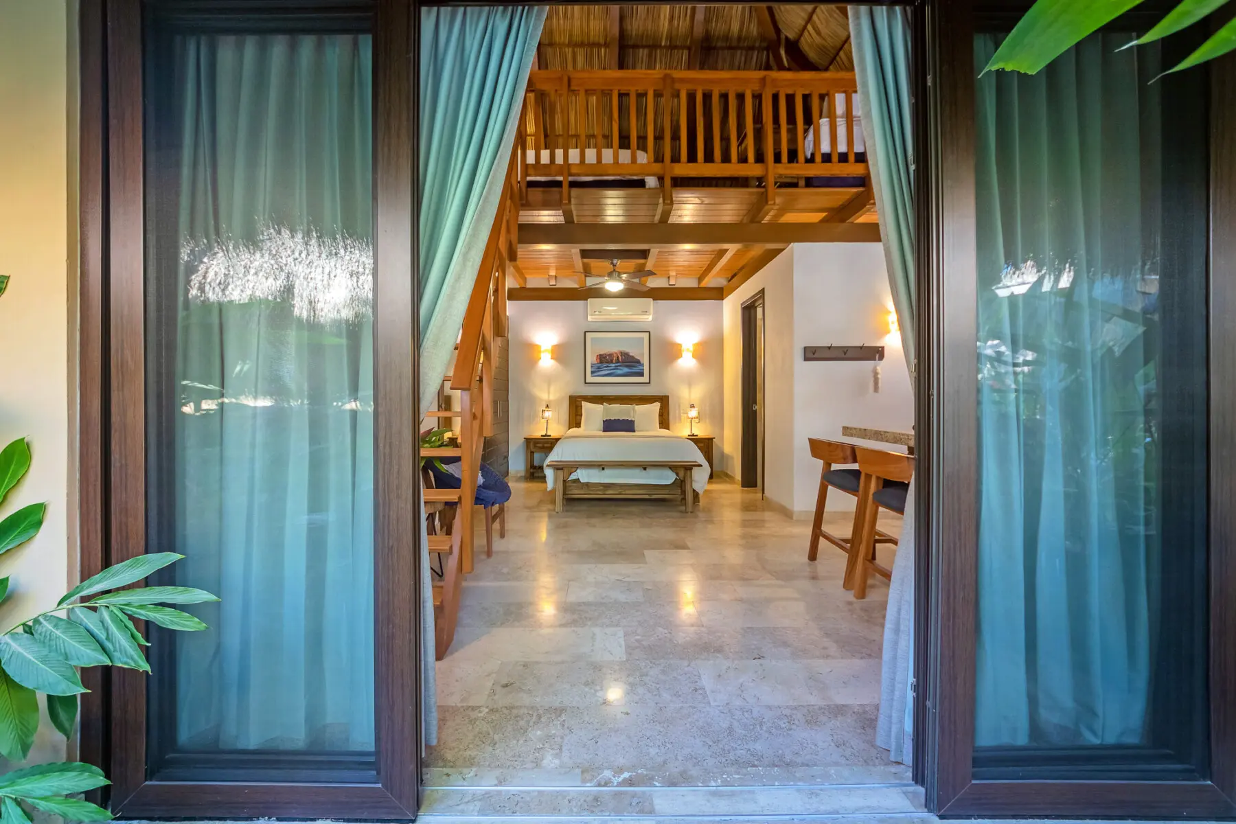 Esta suite incluye una lujosa cama tamaño queen, una cocina totalmente equipada, un baño privado y un altillo con dos camas individuales. La suite Colomo Queen tiene capacidad para cuatro personas y está conectada al dormitorio Monstera con puertas dobles que se pueden abrir o permanecer cerradas.