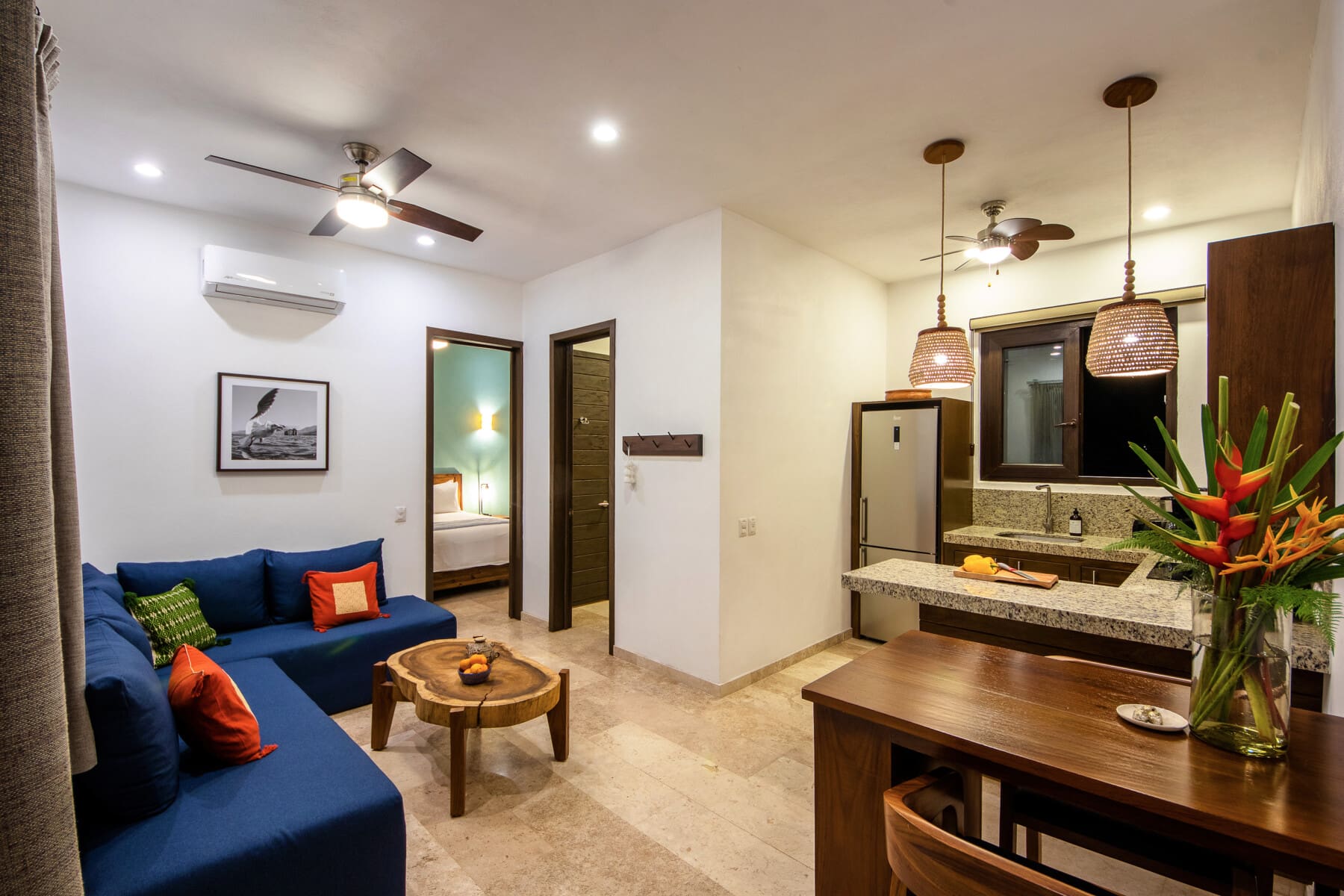 A one-bedroom apartment, this is the only unit on our property where the bedroom is separated from the living space. The bedroom features a king bed, an ensuite bathroom, and a private balcony. In the living space is a pull-out sofa and seating area, dining table, and fully equipped kitchen. The Agave Apartment opens up to the terrace, where group meals are typically enjoyed. Please note that the sofa comfortably sleeps two children or one adult.