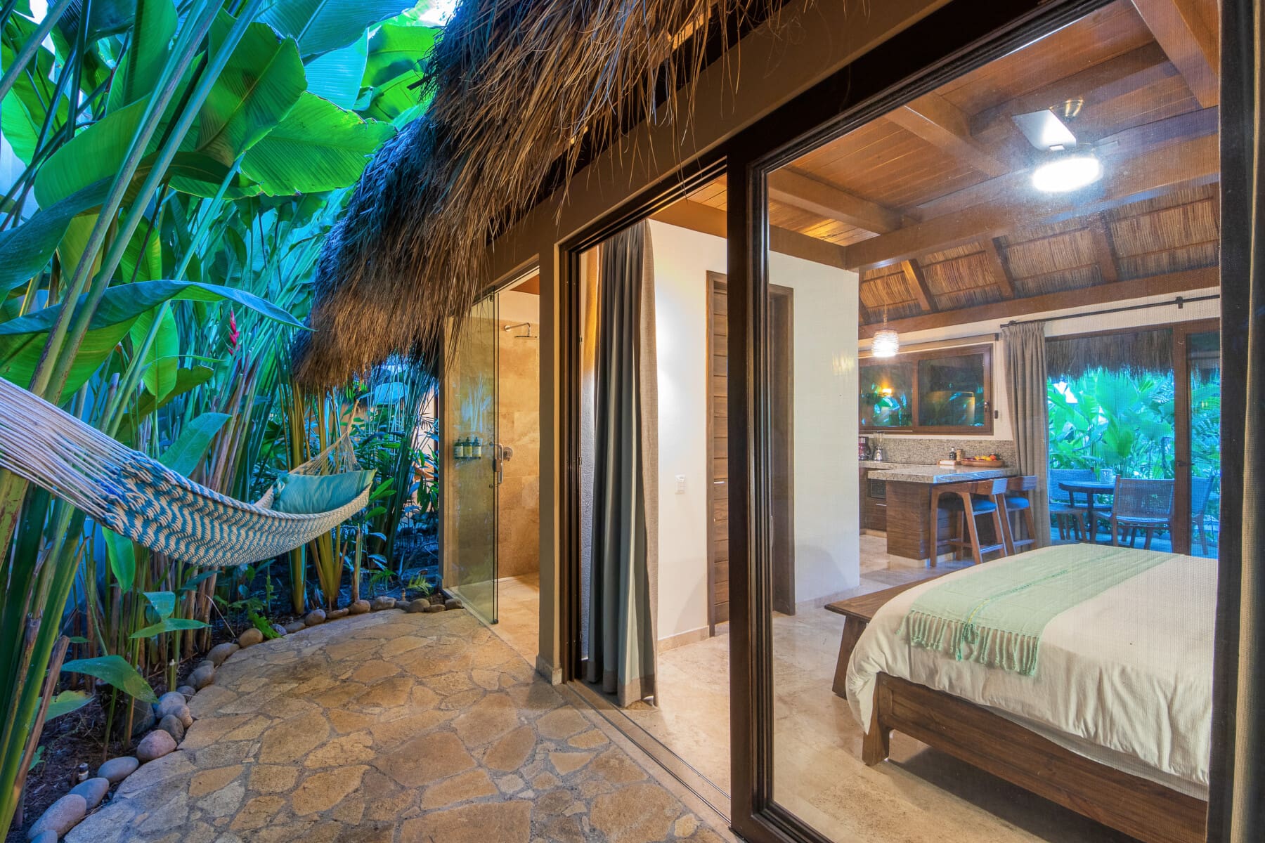 With the same arrangement as the Plumeria King Suite, the Zamia King Suite is also one of our favorite rooms. This suite opens up to a private front garden with its own pool access and sitting area. In a private back patio, a hammock is surrounded by tropical flowers. A luxurious indoor-outdoor shower is the star of the gorgeous bathroom.